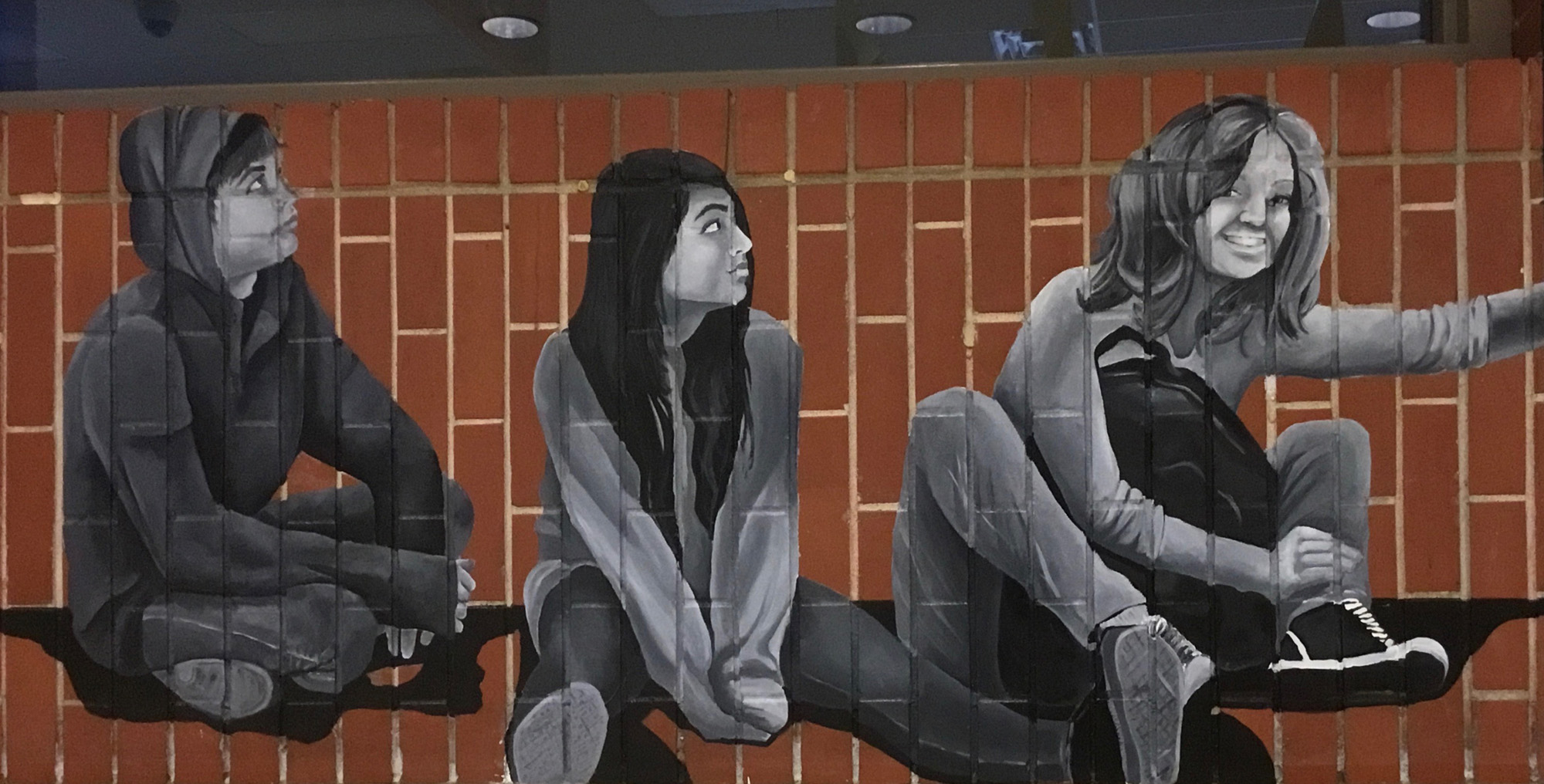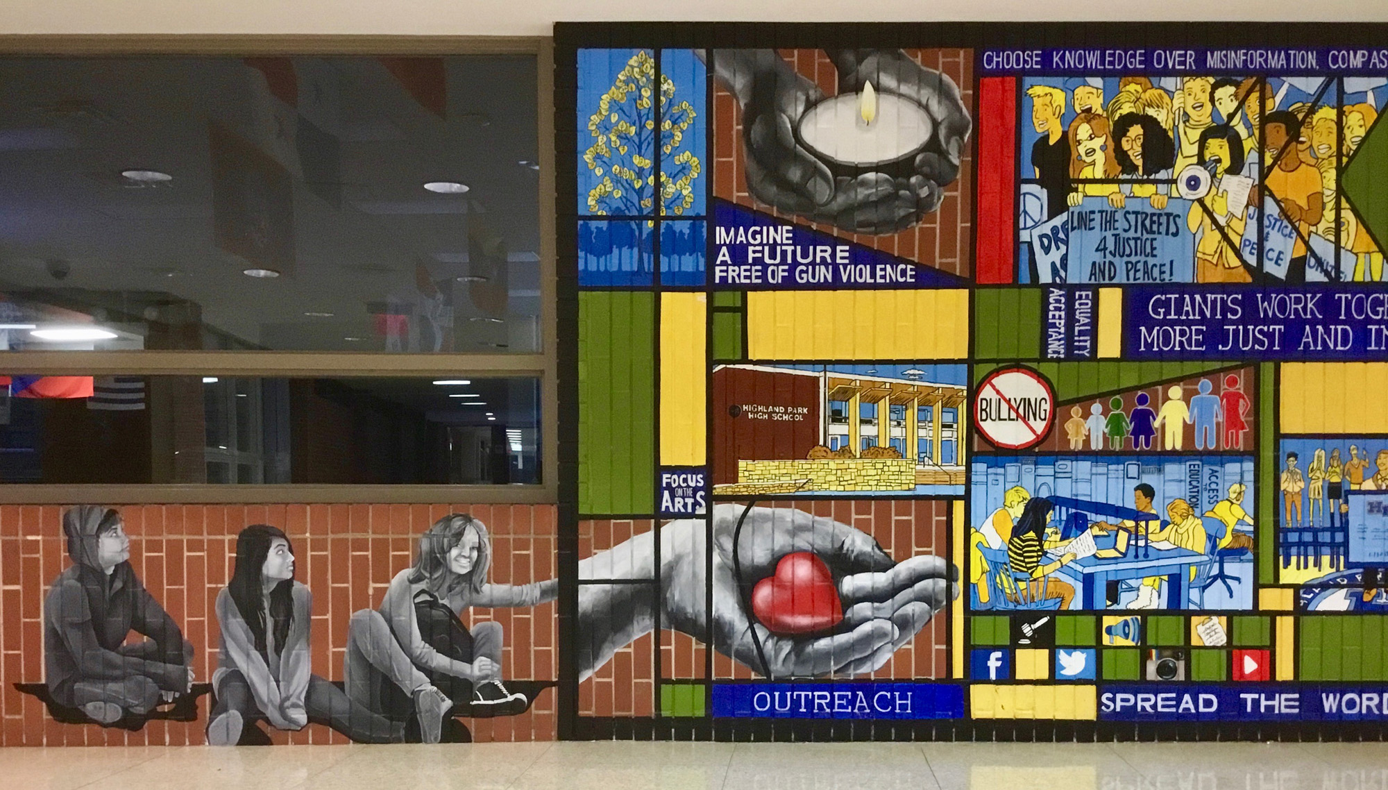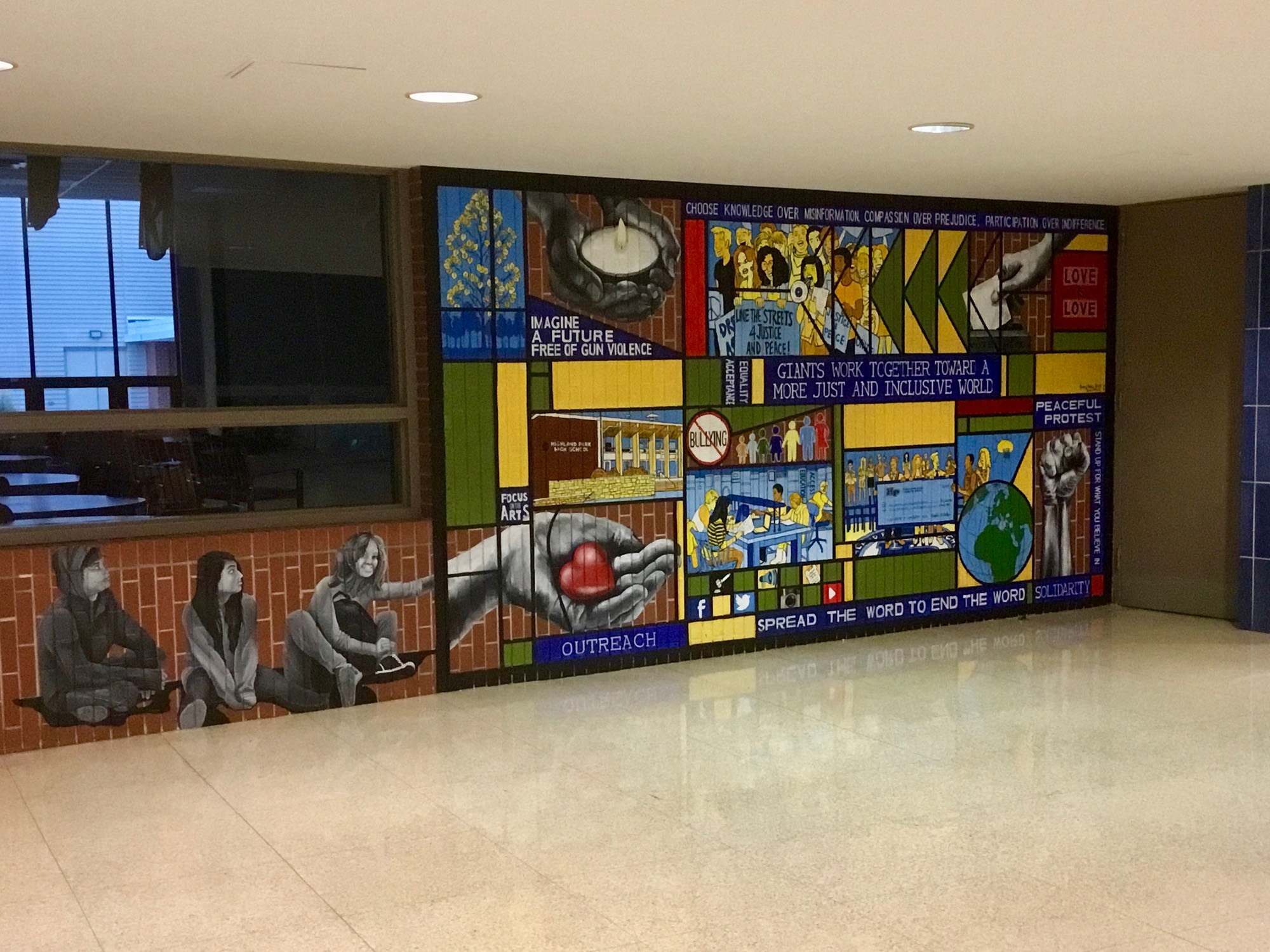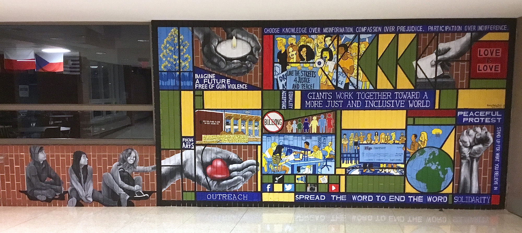 After meeting with HPHS students, faculty and parents to determine the most salient theme and content for the mural, the artists decided that the mural should be about social justice. Entitled “Giants Work Together to Create a More Just and Inclusive World,” the layout of the mural is based on a stained glass design by Frank Lloyd Wright, whose famous architecture is present throughout Highland Park.